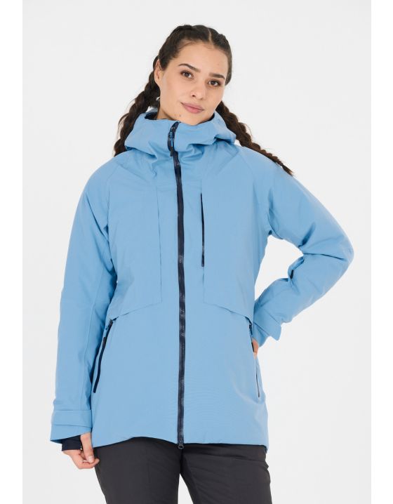 The mechanical stretch ski jacket for women combines high functionality with stylish design and offers optimum protection for all winter outdoor activities. Thanks to the Clima Protect membrane and water-repellent treatment, the jacket is not only waterproof but also breathable, so you always feel comfortable. The Feel Warm Flat insulation ensures that you stay warm even when it's wet. With practical features such as a fixed, adjustable hood, Lycra cuffs with thumb opening, an adjustable hem and a detachable inner gaiter, this jacket is ideal for any adventure in the snow. Additional pockets, a ski pass pocket on the sleeve and wind protection on the front make it a functional choice for female skiers and winter enthusiasts.