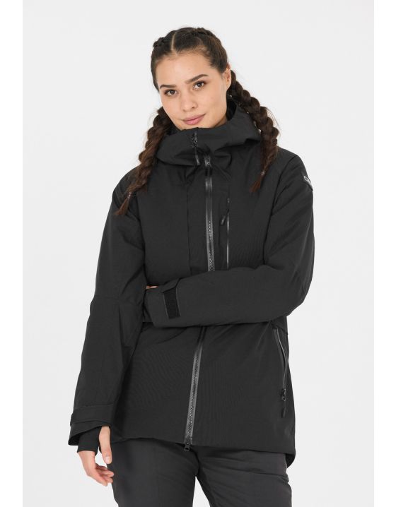 The mechanical stretch ski jacket for women combines high functionality with stylish design and offers optimum protection for all winter outdoor activities. Thanks to the Clima Protect membrane and water-repellent treatment, the jacket is not only waterproof but also breathable, so you always feel comfortable. The Feel Warm Flat insulation ensures that you stay warm even when it's wet. With practical features such as a fixed, adjustable hood, Lycra cuffs with thumb opening, an adjustable hem and a detachable inner gaiter, this jacket is ideal for any adventure in the snow. Additional pockets, a ski pass pocket on the sleeve and wind protection on the front make it a functional choice for female skiers and winter enthusiasts.
