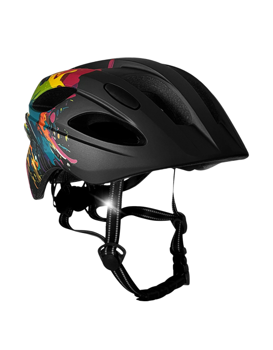 The Crazy Safety helmets are designed for kids aged 6-12 years. Made with high-quality in-mold lightweight EPS foam, these helmets offer both protection and comfort. The adjustable internal rotational dial fit system allows the helmet size to be easily adjusted from 54 cm to 58 cm. For added safety, the helmet includes a USB-rechargeable red LED light with 9 functions, conveniently built into the back. With 15 strategically placed ventilation holes in the front, top, and rear, the helmet ensures a steady airflow. Each helmet also comes with a chin protector pad, removable and washable inner cushions, and is perfect for cycling, skateboarding, scooter riding, balance biking, and rollerblading with both safety and style!